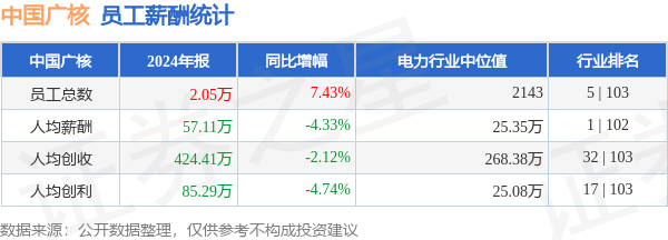 证券之星消息,3月27日中国广核公布2024年年报,当年营收868.04亿元,同比增5.16%;净利润为108.14亿元,同比增0.83%。根据财报数据披露,当年公司员工总数20453人,同比增7.43%;人均薪酬57.11万元,同比减4.33%;人均创收424.41万元,同比减2.12%;人均创利85.29万元,同比减4.74%;公司员工薪酬统计见下表: