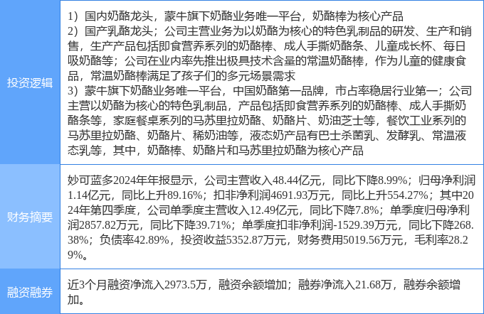 证券之星消息,妙可蓝多3月27日涨停收盘,收盘价23.82元。该股于13点35分涨停,未打开涨停,截止收盘封单资金为4527.23万元,占其流通市值0.37%。