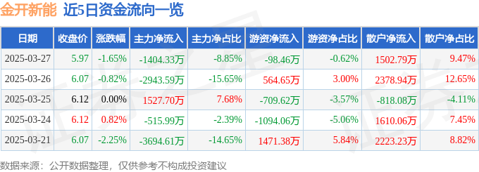 证券之星消息,截至2025年3月27日收盘,金开新能(600821)报收于5.97元,下跌1.65%,换手率1.33%,成交量26.52万手,成交额1.59亿元。