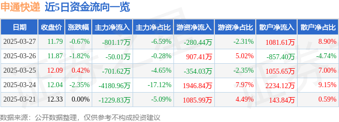 证券之星消息,截至2025年3月27日收盘,申通快递(002468)报收于11.79元,下跌0.67%,换手率0.69%,成交量10.25万手,成交额1.22亿元。