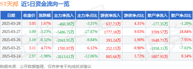 证券之星消息,截至2025年3月28日收盘,ST天邦(002124)报收于3.05元,上涨1.67%,换手率2.47%,成交量48.77万手,成交额1.48亿元。