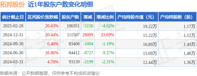 从股价来看,2024年12月31日至2025年2月28日,拓邦股份区间涨幅为20.43%,在此期间股东户数减少5156.0户,减幅为4.62%。