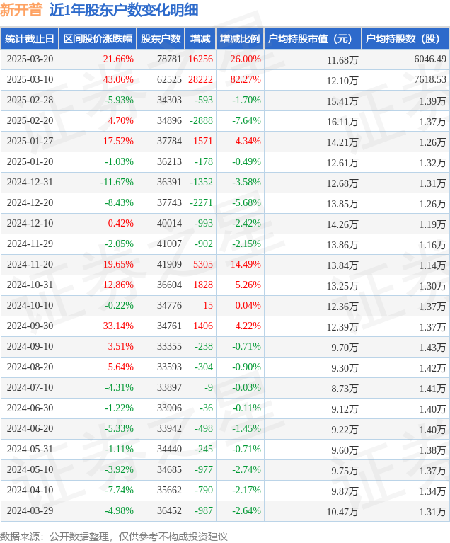 从股价来看,2025年3月10日至2025年3月20日,新开普区间涨幅为21.66%,在此期间股东户数增加1.63万户,增幅为26.0%。
