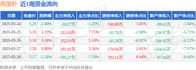 资金流向数据方面,本周两面针主力资金合计净流入304.1万元,游资资金合计净流入965.79万元,散户资金合计净流出1269.89万元。本周资金流向一览见下表: