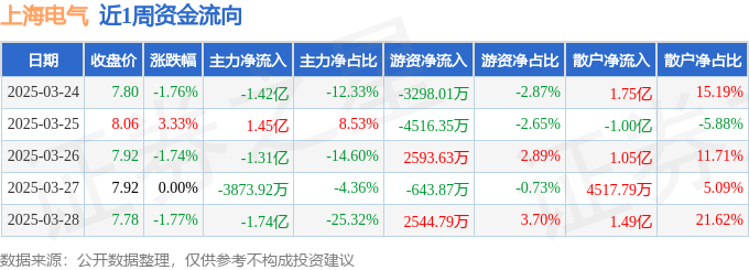 资金流向数据方面,本周上海电气主力资金合计净流出3.41亿元,游资资金合计净流出3319.8万元,散户资金合计净流入3.74亿元。本周资金流向一览见下表: