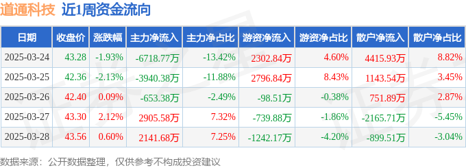 资金流向数据方面,本周道通科技主力资金合计净流出6265.28万元,游资资金合计净流入3019.13万元,散户资金合计净流入3246.15万元。本周资金流向一览见下表: