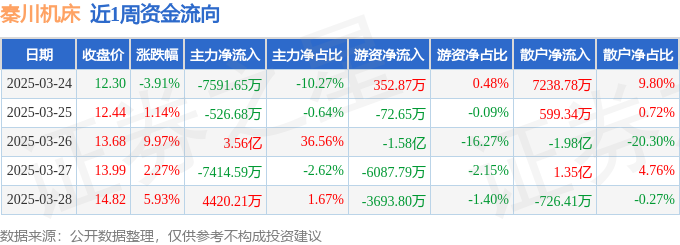 资金流向数据方面,本周秦川机床主力资金合计净流入2.45亿元,游资资金合计净流出2.54亿元,散户资金合计净流入836.89万元。本周资金流向一览见下表: