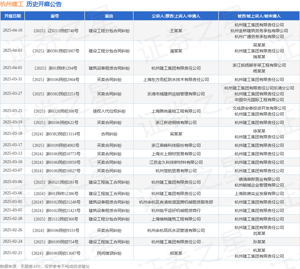 案号:(2025)浙0106民初2904号根据统计,近一年内以杭州建工集团有限责任公司为当事人的历史开庭公告有215则,其中案由为“买卖合同纠纷”的公告以58则居首,其次为“建设工程施工合同纠纷”有41则,“合同纠纷”有30则。历史开庭公告(前20条)如下: