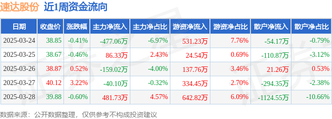 资金流向数据方面,本周速达股份主力资金合计净流出108.13万元,游资资金合计净流入1670.81万元,散户资金合计净流出1562.68万元。本周资金流向一览见下表: