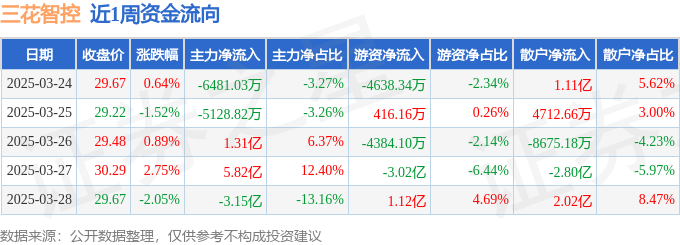 资金流向数据方面,本周三花智控主力资金合计净流入2.82亿元,游资资金合计净流出2.76亿元,散户资金合计净流出621.9万元。本周资金流向一览见下表: