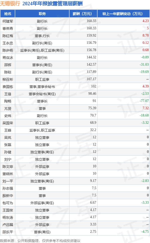证券之星消息,无锡银行发布2024年年报,数据显示:公司主营收入47.26亿元,同比增4.15%。归母净利润为22.52亿元,同比增2.35%。扣非净利润为21.95亿元,同比增8.44%。当年公司员工总数1751人,同比增0.17%。人均薪酬45.85万元(注:"人均薪酬"根据定期报告中"应付职工薪酬"附注的本期增加值 / 员工总数计算而来),同比减1.49%。人均创收269.89万元,同比增3.97%。人均创利128.68万元,同比增1.88%。其中管理层薪酬总额为1958.01万元,同比上一年减4.24%,薪酬最高的为副行长何建军,薪酬160.33万元。
