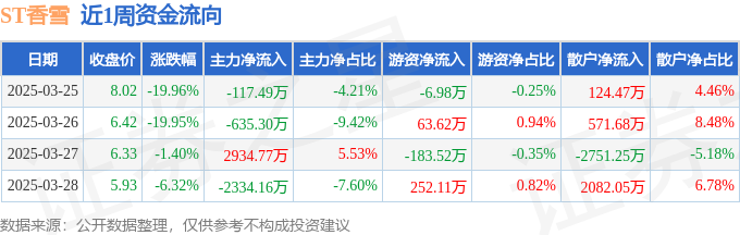 资金流向数据方面,本周ST香雪主力资金合计净流出152.19万元,游资资金合计净流入125.24万元,散户资金合计净流入26.94万元。本周资金流向一览见下表: