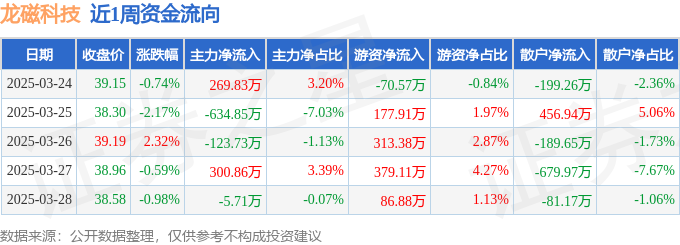资金流向数据方面,本周龙磁科技主力资金合计净流出193.6万元,游资资金合计净流入886.71万元,散户资金合计净流出693.11万元。本周资金流向一览见下表: