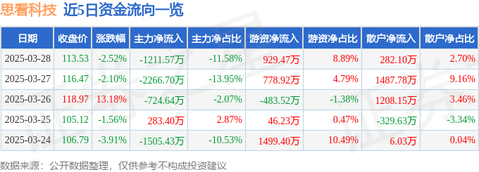 证券之星消息,截至2025年3月28日收盘,思看科技(688583)报收于113.53元,下跌2.52%,换手率7.14%,成交量9130.0手,成交额1.05亿元。