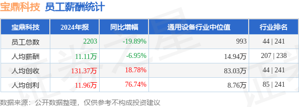 证券之星消息,3月29日宝鼎科技公布2024年年报,当年营收28.94亿元,同比减4.85%;净利润为2.48亿元,同比增33.7%。根据财报数据披露,当年公司员工总数2203人,同比减19.89%;人均薪酬11.11万元,同比减6.95%;人均创收131.37万元,同比增18.78%;人均创利11.96万元,同比增76.74%;公司员工薪酬统计见下表: