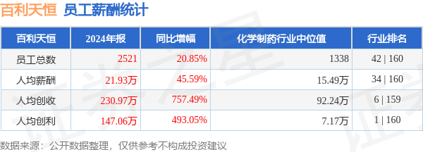 证券之星消息,3月29日百利天恒公布2024年年报,当年营收58.23亿元,同比增936.31%;净利润为37.08亿元,同比增575.02%。根据财报数据披露,当年公司员工总数2521人,同比增20.85%;人均薪酬21.93万元,同比增45.59%;人均创收230.97万元,同比增757.49%;人均创利147.06万元,同比增493.05%;公司员工薪酬统计见下表: