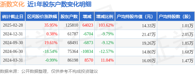 从股价来看,2024年12月31日至2025年2月28日,浙数文化区间涨幅为35.95%,在此期间股东户数增加6.4万户,增幅为103.62%。