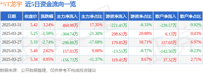 证券之星消息,截至2025年3月31日收盘,*ST龙宇(603003)报收于5.42元,上涨3.24%,换手率1.32%,成交量4.97万手,成交额2657.05万元。