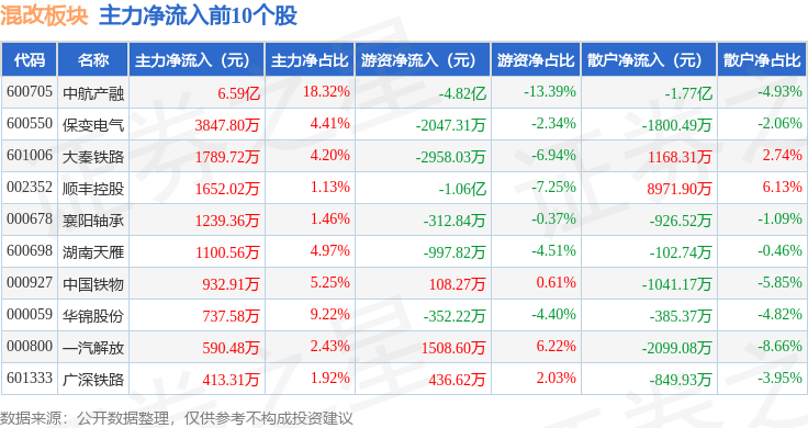 从资金流向上来看,当日混改板块主力资金净流出8.25亿元,游资资金净流出2.29亿元,散户资金净流入10.53亿元。混改板块个股资金流向见下表: