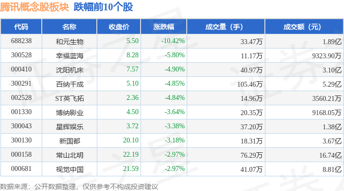 证券之星消息,3月31日腾讯概念股板块较上一交易日下跌0.31%,和元生物领跌。当日上证指数报收于3335.75,下跌0.46%。深证成指报收于10504.33,下跌0.97%。腾讯概念股板块个股涨跌见下表: