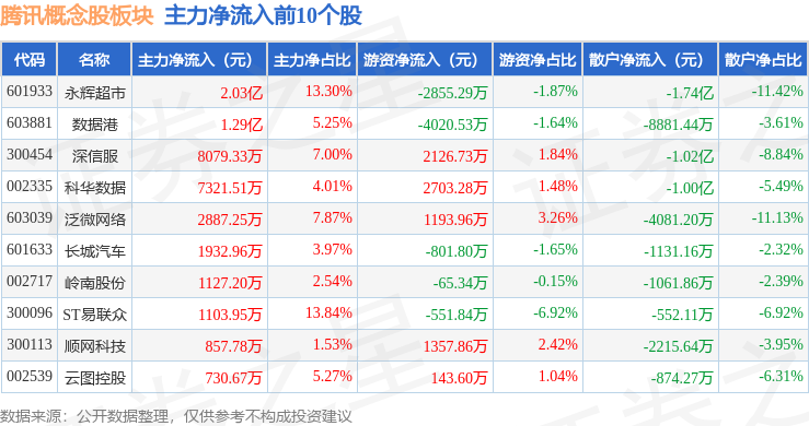 从资金流向上来看,当日腾讯概念股板块主力资金净流出10.06亿元,游资资金净流入2107.02万元,散户资金净流入9.84亿元。腾讯概念股板块个股资金流向见下表: