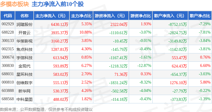 从资金流向上来看,当日多模态板块主力资金净流出19.93亿元,游资资金净流入7799.76万元,散户资金净流入19.15亿元。多模态板块个股资金流向见下表: