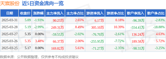 证券之星消息,截至2025年3月31日收盘,天宸股份(600620)报收于5.09元,下跌1.93%,换手率0.97%,成交量6.66万手,成交额3406.08万元。