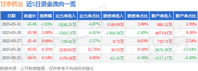 证券之星消息,截至2025年3月31日收盘,甘李药业(603087)报收于45.06元,下跌1.83%,换手率1.18%,成交量6.53万手,成交额2.96亿元。