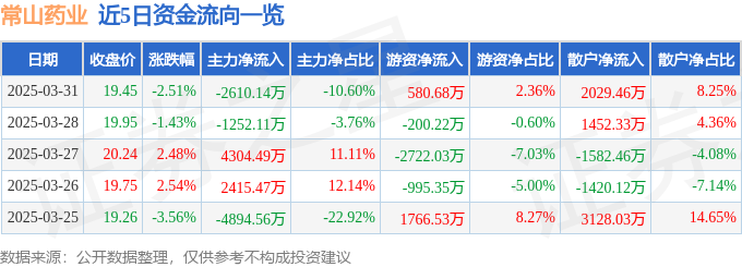 证券之星消息,截至2025年3月31日收盘,常山药业(300255)报收于19.45元,下跌2.51%,换手率1.38%,成交量12.6万手,成交额2.46亿元。