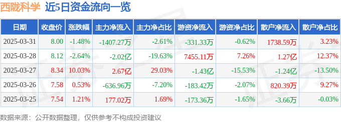 证券之星消息,截至2025年3月31日收盘,西陇科学(002584)报收于8.0元,下跌1.48%,换手率15.51%,成交量67.09万手,成交额5.38亿元。