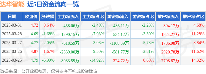 证券之星消息,截至2025年3月31日收盘,达华智能(002512)报收于4.72元,上涨0.64%,换手率3.94%,成交量41.36万手,成交额1.91亿元。
