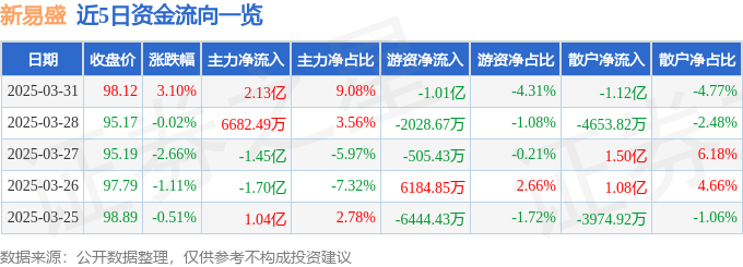 证券之星消息,截至2025年3月31日收盘,新易盛(300502)报收于98.12元,上涨3.1%,换手率3.87%,成交量24.39万手,成交额23.47亿元。