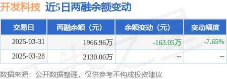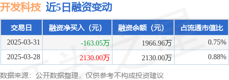 证券之星消息,3月31日,开发科技(920029)融资买入1220.36万元,融资偿还1383.41万元,融资净卖出163.05万元,融资余额1966.96万元。