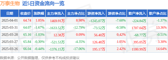 证券之星消息,截至2025年4月1日收盘,万泰生物(603392)报收于64.74元,上涨1.05%,换手率0.2%,成交量2.52万手,成交额1.64亿元。