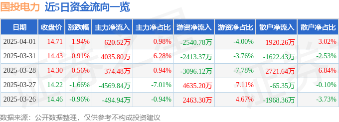证券之星消息,截至2025年4月1日收盘,国投电力(600886)报收于14.71元,上涨1.94%,换手率0.58%,成交量43.57万手,成交额6.36亿元。