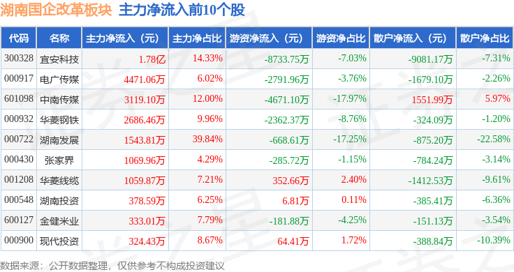 从资金流向上来看,当日湖南国企改革板块主力资金净流入1.37亿元,游资资金净流出1.63亿元,散户资金净流入2586.88万元。湖南国企改革板块个股资金流向见下表: