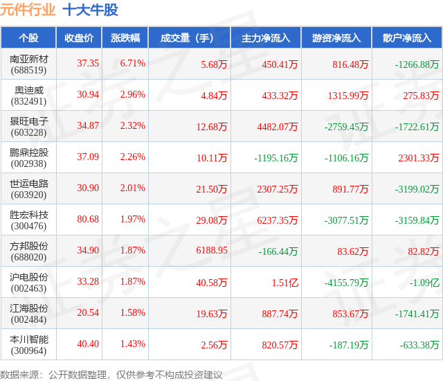 个股表现方面,元件行业当日领涨股为南亚新材(688519),该股当日报收37.35,上涨6.71%,成交量5.68万,主力资金净流入450.41万元。奥迪威(832491)以上涨2.96%紧随其后,该股当日成交量4.84万,主力资金净流入433.32万元。除此之外,景旺电子(603228)、鹏鼎控股(002938)、世运电路(603920)均进入当日牛股之列。具体个股列表见下表: