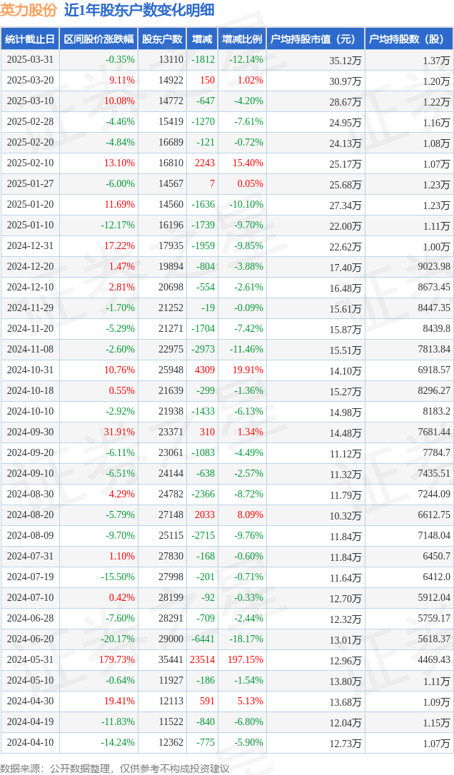 从股价来看,2025年3月20日至2025年3月31日,英力股份区间跌幅为0.35%,在此期间股东户数减少1812.0户,减幅为12.14%。