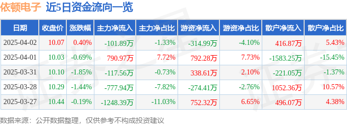 证券之星消息,截至2025年4月2日收盘,依顿电子(603328)报收于10.07元,上涨0.4%,换手率0.76%,成交量7.6万手,成交额7675.93万元。