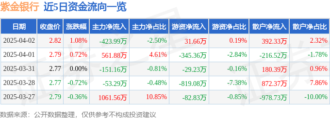 证券之星消息,截至2025年4月2日收盘,紫金银行(601860)报收于2.82元,上涨1.08%,换手率1.7%,成交量60.22万手,成交额1.69亿元。