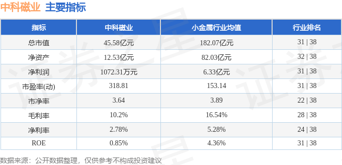 中科磁业2024年三季报显示,公司主营收入3.86亿元,同比上升3.42%;归母净利润1072.31万元,同比下降71.87%;扣非净利润829.27万元,同比下降72.93%;其中2024年第三季度,公司单季度主营收入1.35亿元,同比上升7.98%;单季度归母净利润510.04万元,同比下降57.01%;单季度扣非净利润434.79万元,同比下降61.07%;负债率17.65%,投资收益10.52万元,财务费用-1031.73万元,毛利率10.2%。中科磁业(301141)主营业务:主要从事永磁材料的研发、生产和销售。