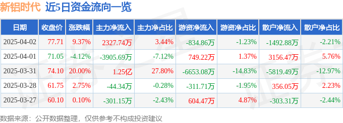 证券之星消息,截至2025年4月2日收盘,新铝时代(301613)报收于77.71元,上涨9.37%,换手率38.7%,成交量8.8万手,成交额6.76亿元。