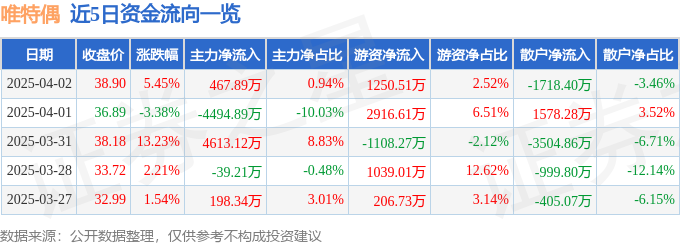 证券之星消息,截至2025年4月2日收盘,唯特偶(301319)报收于38.9元,上涨5.45%,换手率33.56%,成交量12.97万手,成交额4.97亿元。