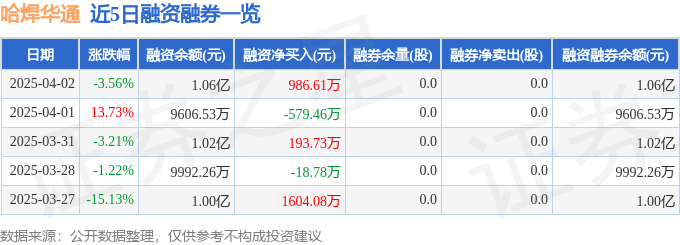 哈焊华通融资融券信息显示,融资方面,当日融资买入3777.95万元,融资偿还2791.35万元,融资净买入986.61万元。融券方面,融券卖出0.0股,融券偿还0.0股,融券余量0.0股,融券余额0.0万元。融资融券余额1.06亿元。