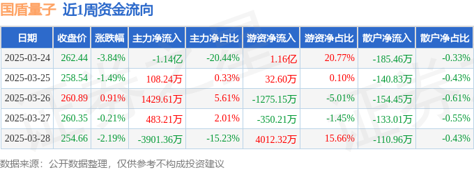 资金流向数据方面,本周国盾量子主力资金合计净流出1.33亿元,游资资金合计净流入1.4亿元,散户资金合计净流出724.72万元。本周资金流向一览见下表: