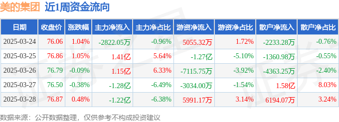 资金流向数据方面,本周美的集团主力资金合计净流出2267.75万元,游资资金合计净流出1.18亿元,散户资金合计净流入1.41亿元。本周资金流向一览见下表: