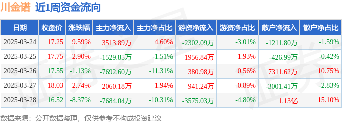 资金流向数据方面,本周川金诺主力资金合计净流出1.13亿元,游资资金合计净流出2598.07万元,散户资金合计净流入1.39亿元。本周资金流向一览见下表: