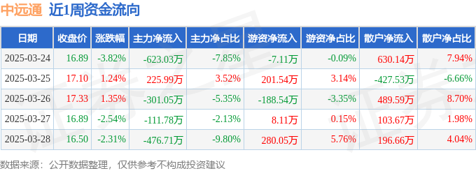 资金流向数据方面,本周中远通主力资金合计净流出1286.57万元,游资资金合计净流入294.04万元,散户资金合计净流入992.53万元。本周资金流向一览见下表: