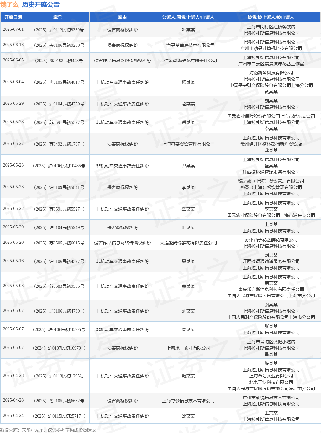 案号:(2025)沪0105民初2996号根据统计,近一年内以上海拉扎斯信息科技有限公司为当事人的历史开庭公告有455则,其中案由为“非机动车交通事故责任纠纷”的公告以224则居首,其次为“侵害商标权纠纷”有66则,“机动车交通事故责任纠纷”有50则。历史开庭公告(前20条)如下: