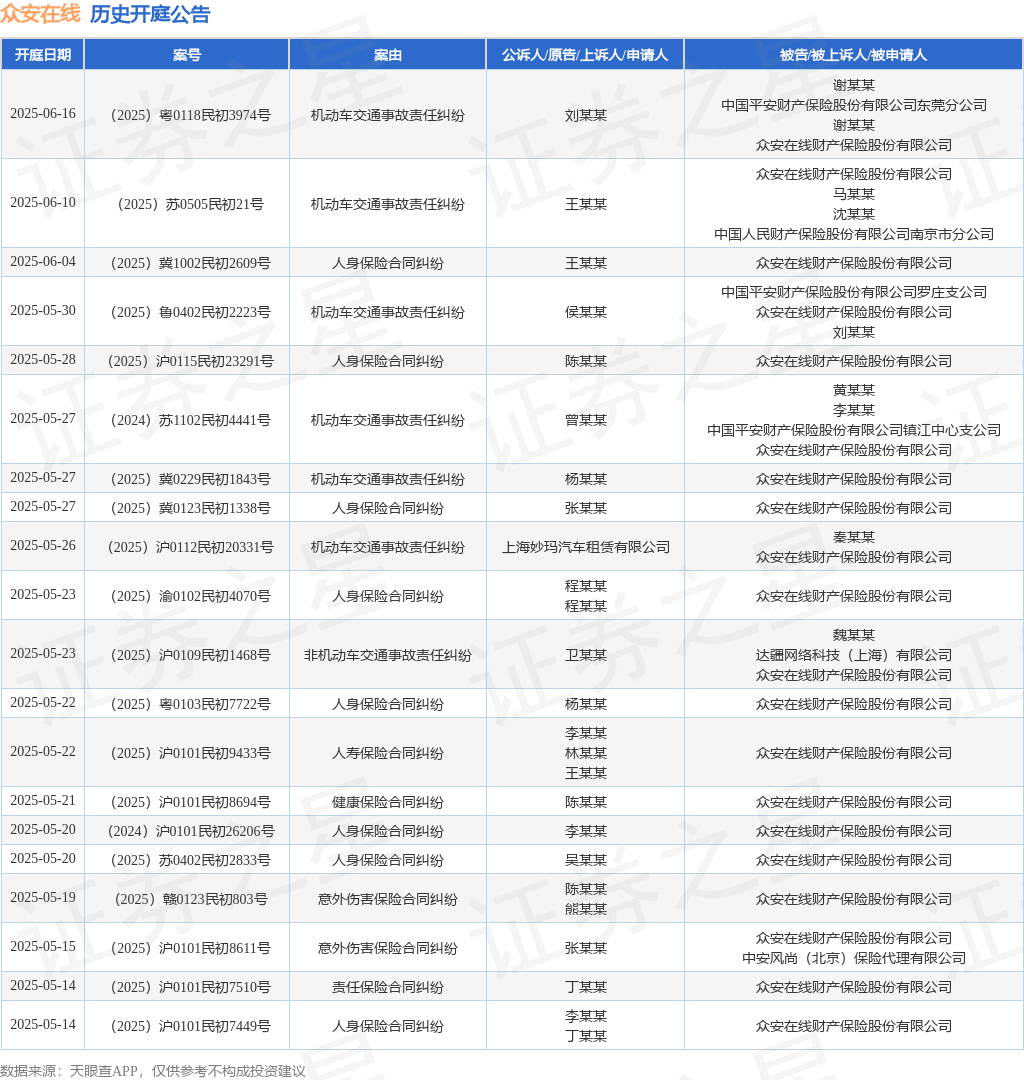 案号:(2025)苏0324民初2348号根据统计,近一年内以众安在线财产保险股份有限公司为当事人的历史开庭公告有4165则,其中案由为“保证保险合同纠纷”的公告以2715则居首,其次为“人身保险合同纠纷”有563则,“机动车交通事故责任纠纷”有247则。历史开庭公告(前20条)如下: